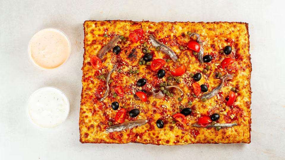 Sourdough tijesto (bezkvasno , kiselo tijesto) deblje, prozračno, odozdola hrskavo,"Zapečeni rub" (rubovi prekriveni i zapečeni sa sirom, cijela piiza prekrivena sa sirom), pizza pravokutnog oblika, deblje tijesto