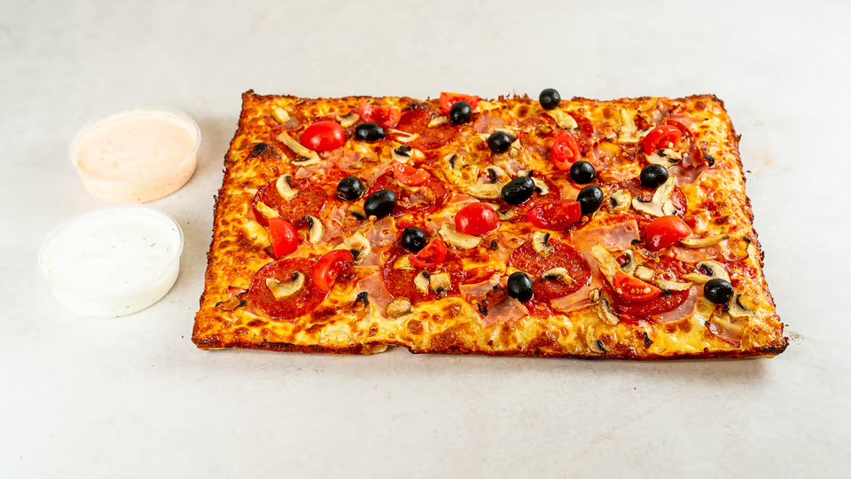 Podijelite Thick veliku pizzu po pola i izaberite svakoj polovici vrstu. Sourdough tijesto (bezkvasno , kiselo tijesto) deblje, prozračno, odozdola hrskavo,"Zapečeni rub" (rubovi prekriveni i zapečeni sa sirom, cijela piiza prekrivena sa sirom), pizza pravokutnog oblika, deblje tijesto